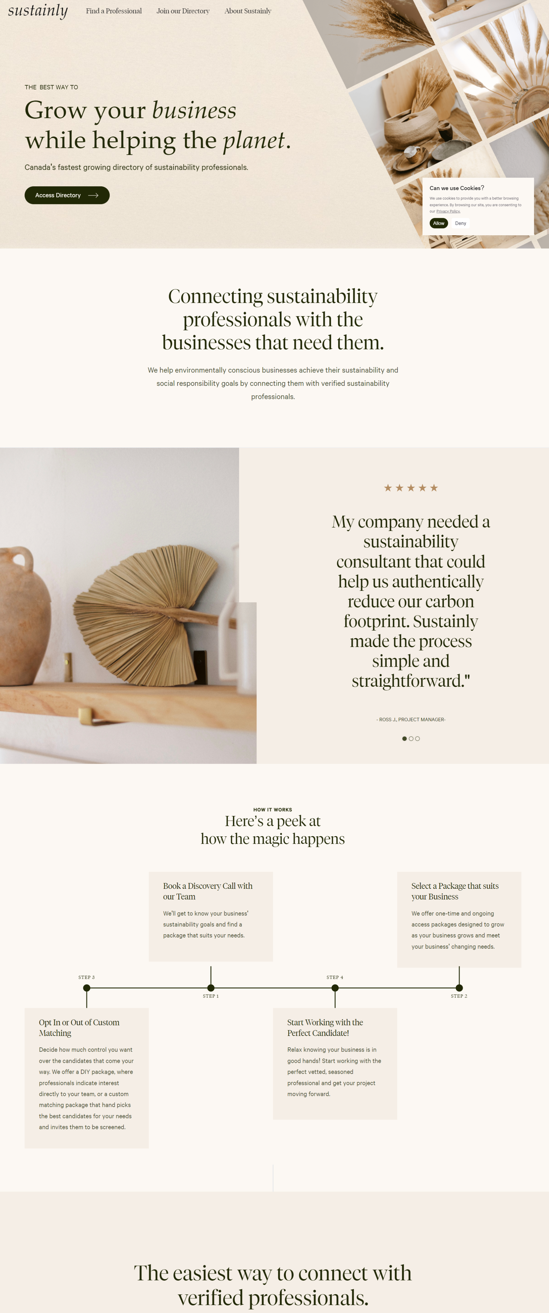 Sustainly came to us pre-launch wanting a soft, modern look for a new sustainability initiative. As a subscription-based service linking individuals and small businesses to vetted sustainability professionals, they wanted to create a website that conveyed the uniqueness of their service, as well as the simplicity of the process of working with them. They wanted an easy-to-use website that offered viewers multiple pathways to get in touch with the Sustainly team.